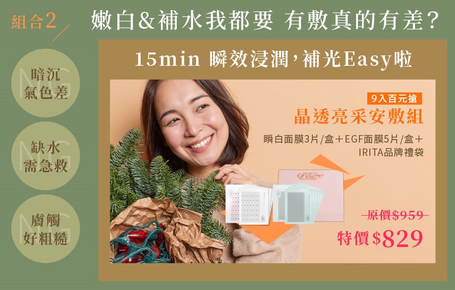 這個組合非常紮實、誠意也滿滿,瞬白面膜主打提亮與柔霧美肌效果,敷完臉色會明顯變亮,很適合聚會與派對滿滿的年末;至於EGF面膜則主要負責補水、舒緩、穩定肌膚,整組的CP值非常高,是很多人交換禮物收到也會很開心的面膜聖誕組合。