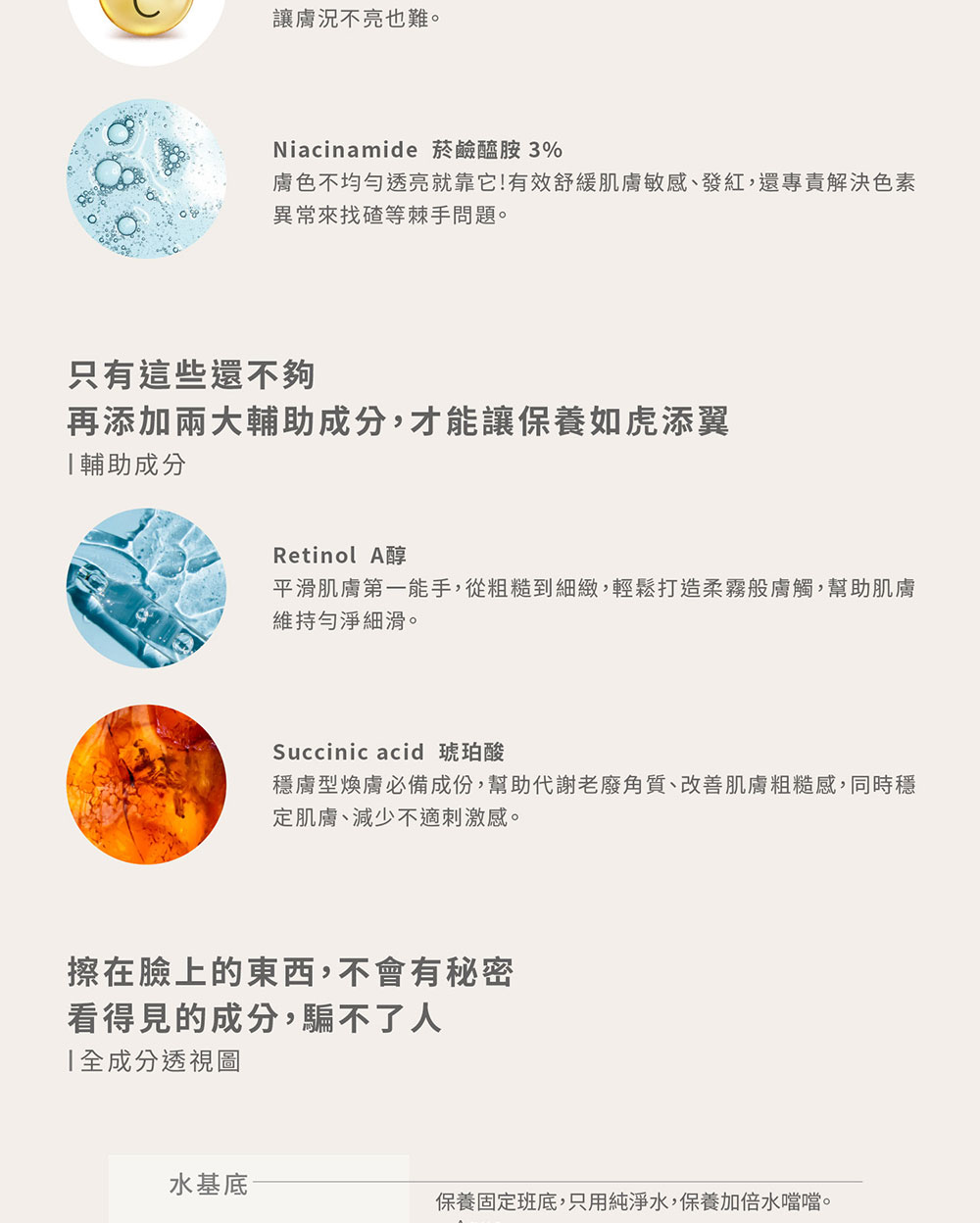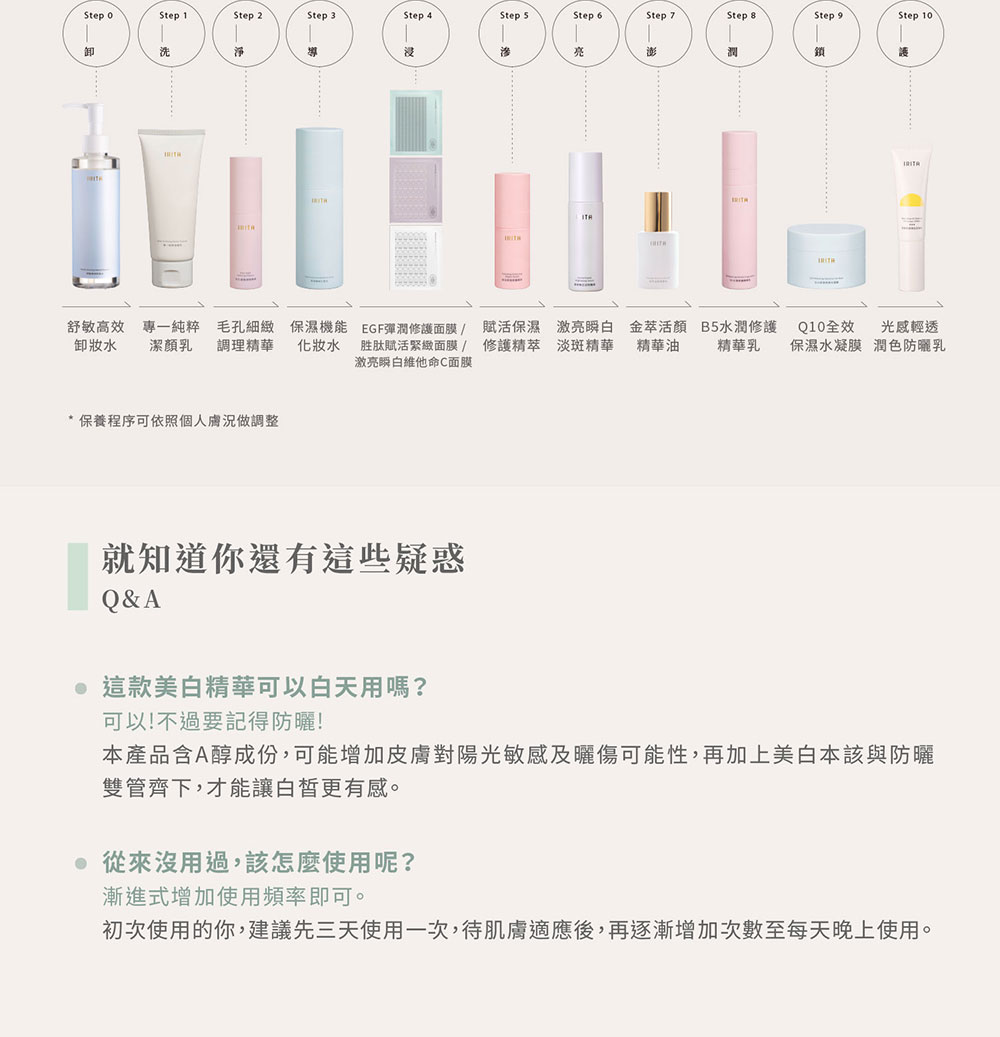 初期請避免與酸類保養品併用。如肌膚出現不適感,建議減少使用頻率,或暫停使用並視情況調整。