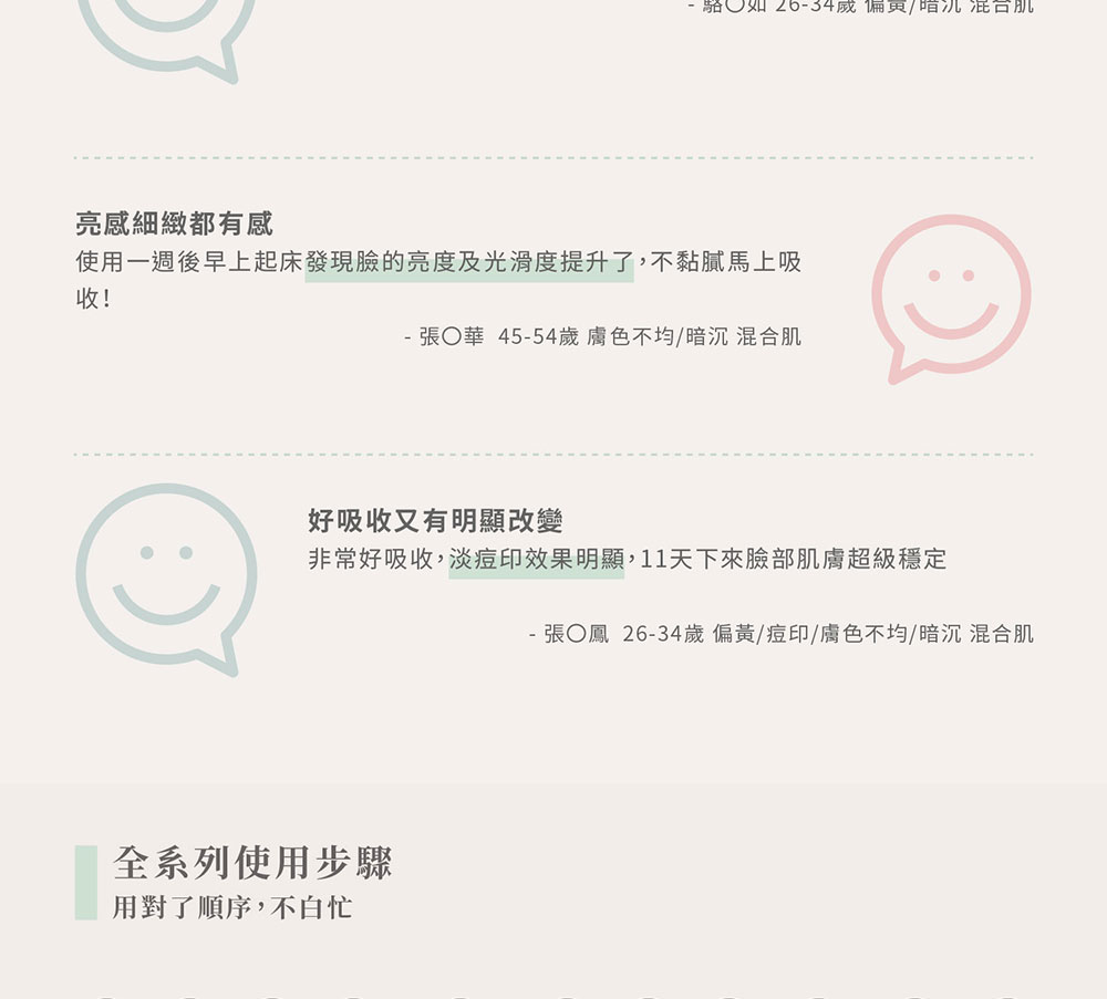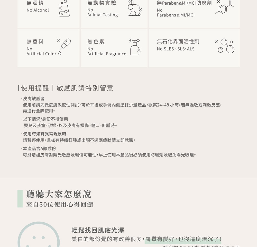 全產品不含人工香精, 部分產品含有天然精油,孕婦請遵照醫囑使用;特殊敏感性肌膚使用前請先進行局部測試後再使用。