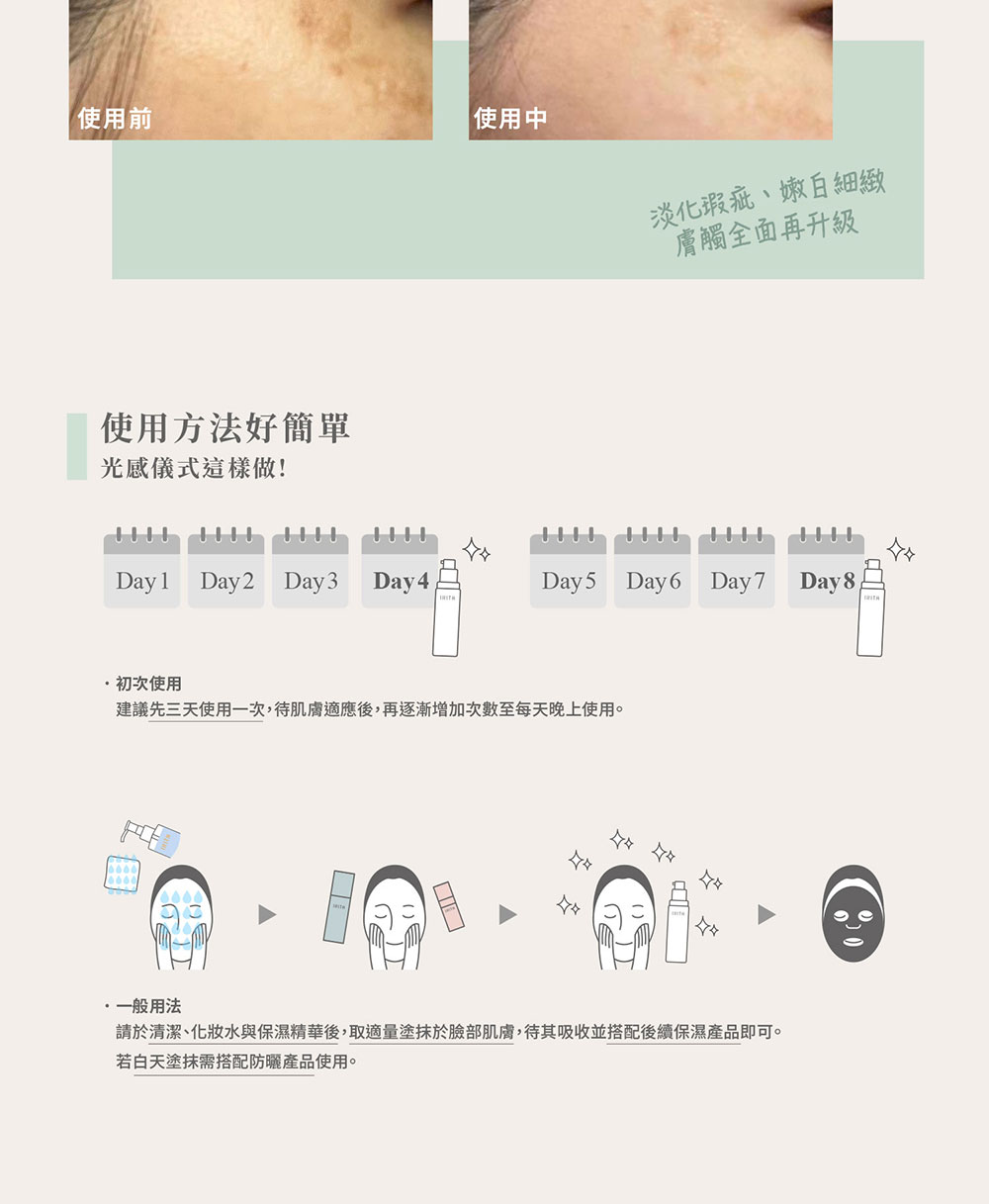 使用期間應加強保濕,白天需搭配防曬產品,避免長時間暴露在陽光下。